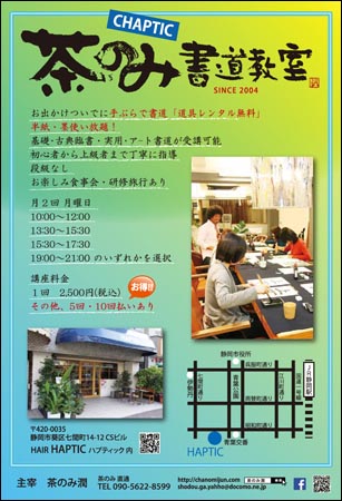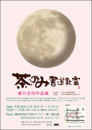 現代的で自由な作風から古典臨書まで幅広く愉しめる茶のみ書道教室作品展。今回花をそえるのは「花は咲く」合同作品。これは子供から大人まで各教室の皆さんが 東日本大震災の復興を願って書き上げました。是非ご高覧ください。