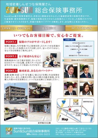 Sun&Sun総合保険事務所は、浜松市と静岡市を中心とした地域密着型の保険代理店です。生命保険・損害保険問わず、複数の保険会社の中からお客様のニーズに合った保険のカタチを ご提案させていただきます。皆様の保険のハテナ?を解消します。お気軽にご来店ください。