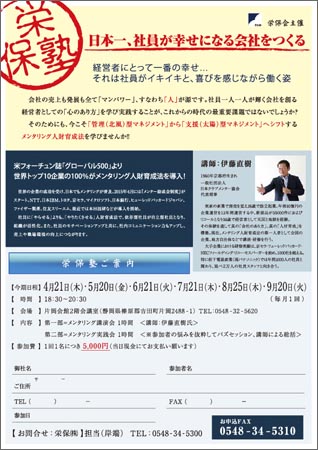 「儲かる会社」をつくるには、なんといっても「人もうけ」を本気で考えることです。 社員一人一人が輝く会社を創る経営者としての「心のあり方」を学び実践することが、 これからの時代の最重要課題ではないでしょうか?そのためにも、今こそ 「管理(北風)型マネジメント」から「支援(太陽)型マネジメント」 へシフトするメンタリング人財育成法を学びませんか!
